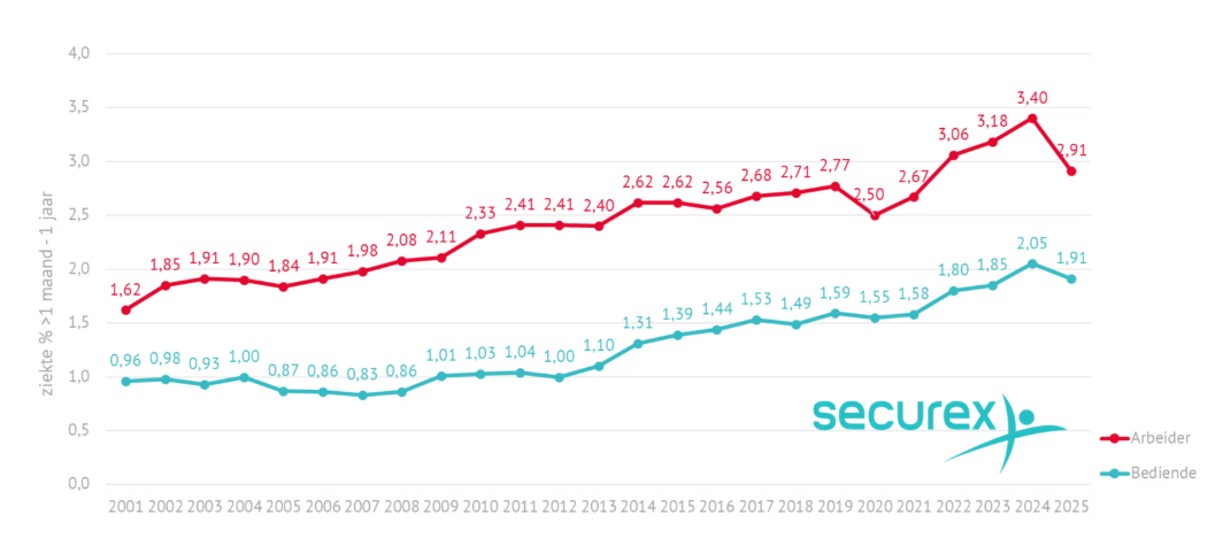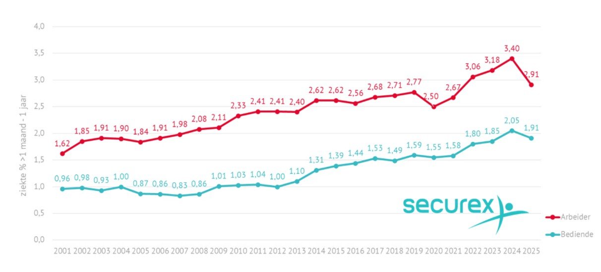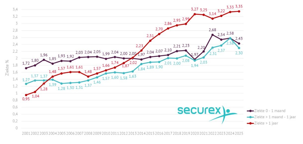 Naast middellang absenteïsme (1 maand tot 1 jaar), dat vorig jaar van 2,58% naar 2,30% daalde, is de algemene daling van het ziektepercentage ook zichtbaar bij kort absenteïsme (tot 1 maand), dat afnam met 5,8% (van 2,58% naar 2,43%). Het langdurig absenteïsme (langer dan 1 jaar) blijft echter op een historisch hoog niveau van 3,35% in 2025.