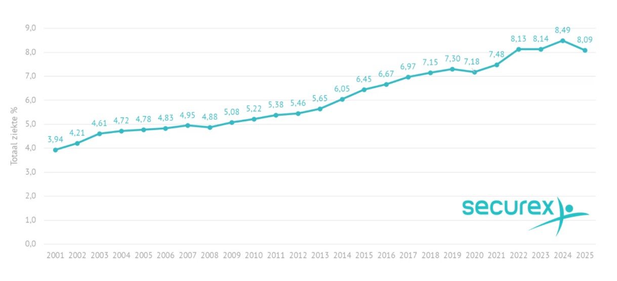 - Het totale ziektepercentage van werknemers daalde in 2025 naar 8,09% (van 8,49% in 2024): de eerste significante daling in 25 jaar.