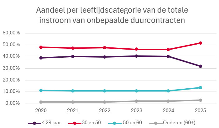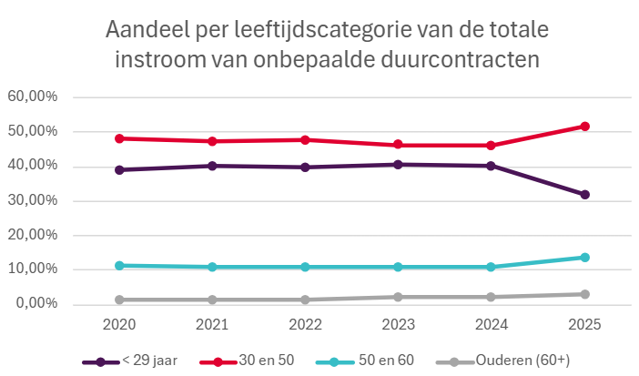 De terughoudendheid om jongeren een onbepaalde duurcontract aan te bieden is opvallend. Het aandeel van werknemers jonger dan 30 bij alle nieuwe contracten van onbepaalde duur kelderde van 40,3% in 2024 naar 31,8% in 2025, een relatieve daling van 21,3%. Die vrijgekomen ruimte wordt ingenomen door meer ervaren profielen. Het aandeel van de 30- tot 50-jarigen bij nieuwe aanwervingen van onbepaalde duur steeg in dezelfde periode van 46,3% naar 51,6%. Werkgevers lijken in de huidige context duidelijk de voorkeur te geven aan direct inzetbare, ervaren krachten.