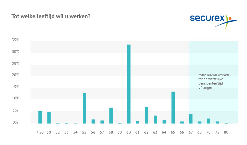Meer dan 4 op 5 (84%) zegt niet te kunnen werken tot hij 67 is, en 63% zegt zelfs niet te kunnen werken tot zijn 65ste. Vooral vrouwen, werknemers ouder dan 50 en lager opgeleiden voelen zich fysiek en mentaal niet in staat om tot de wettelijke pensioenleeftijd te werken.