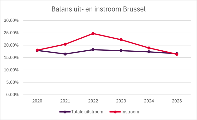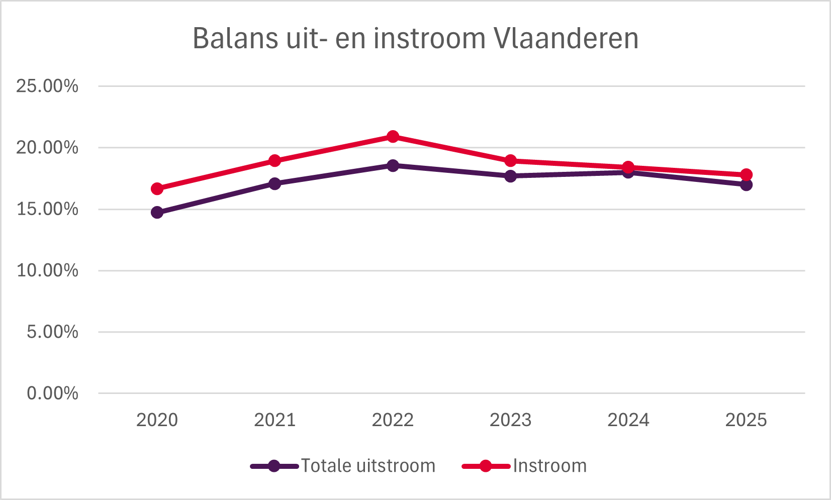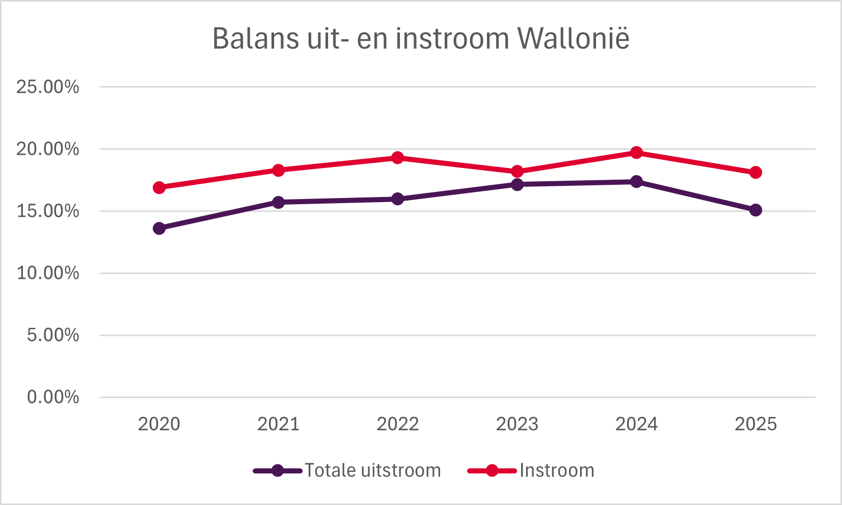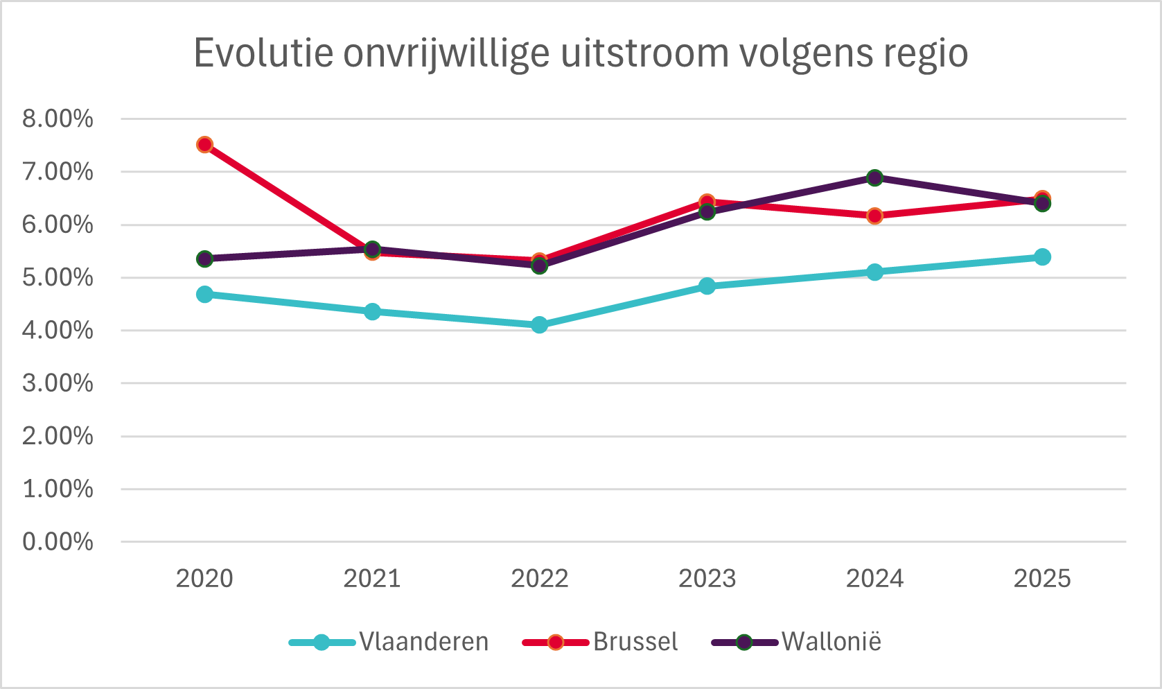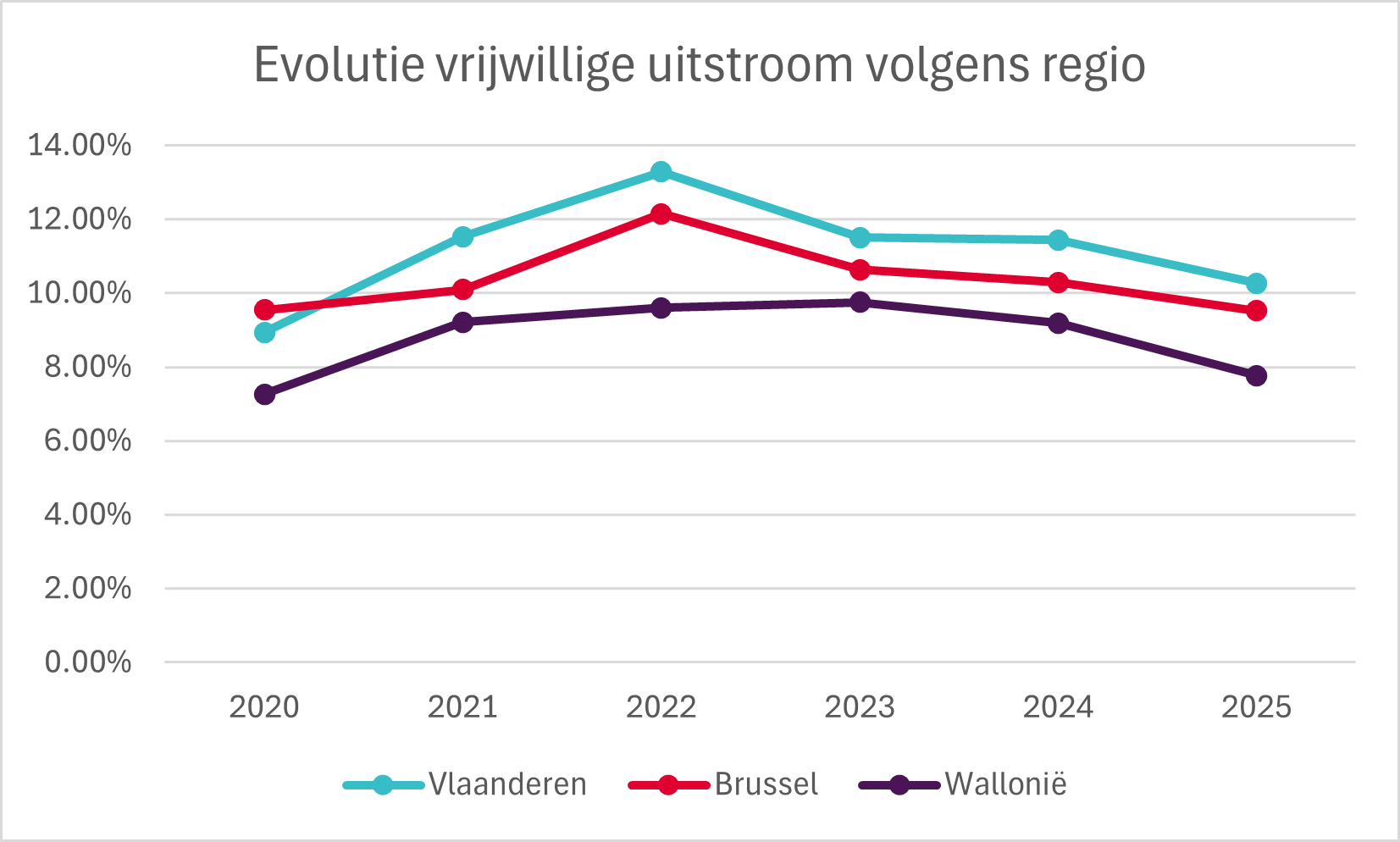 De meest opvallende trend is de sterke daling van de vrijwillige uitstroom, die in alle regio’s merkbaar is. In Vlaanderen daalde dit cijfer van 11,44% naar 10,26% (-10,24%), terwijl Wallonië de sterkste daling noteerde van 9,19% naar 7,76% (-15,48%). Ook in Brussel is een dalende trend zichtbaar (van 10,28% naar 9,52%).